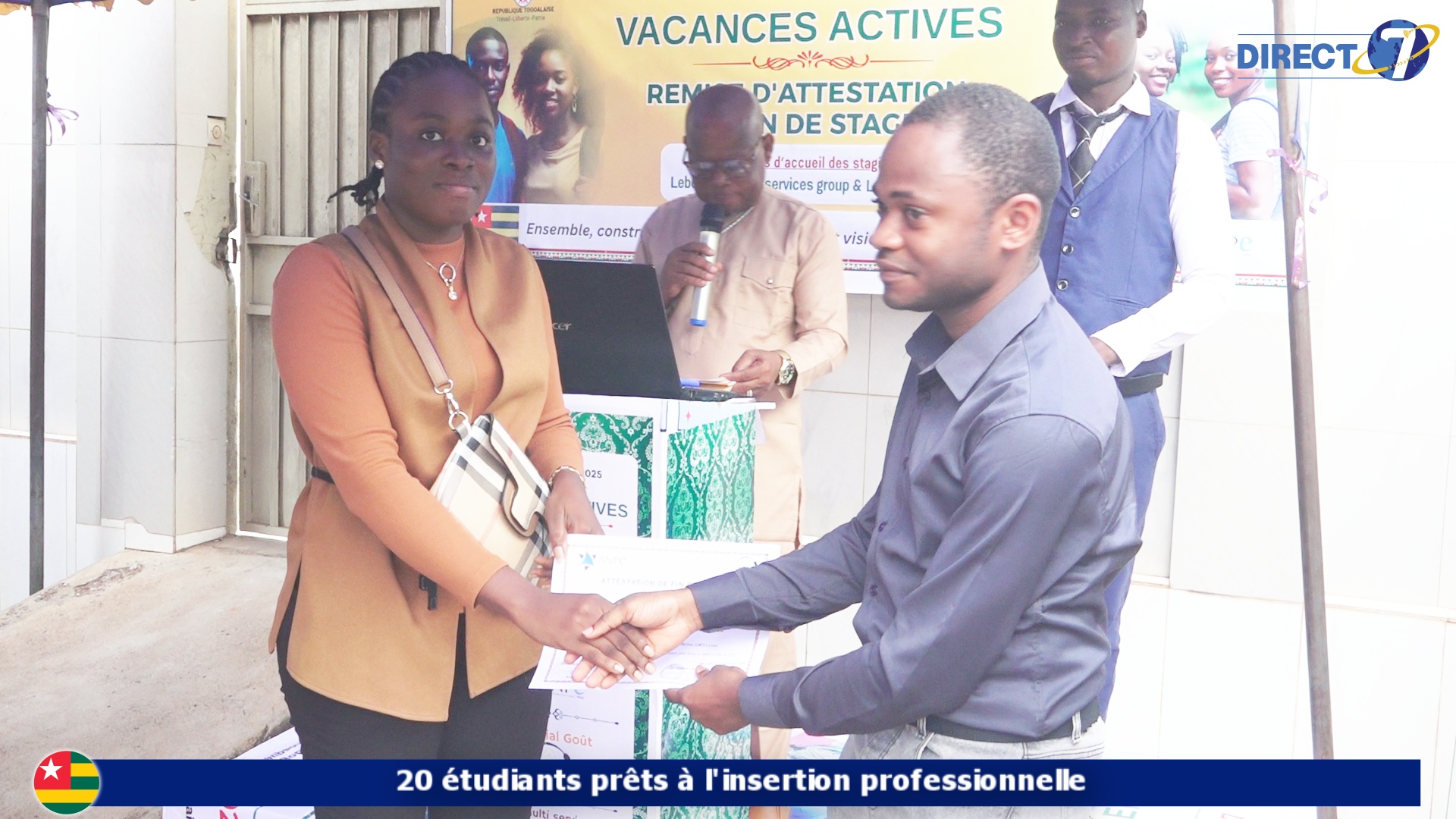 @direct7 Dans le cadre de son projet dénommé vacances actives, lebongrain multi services group à délivré ce samedi 29 novembre à Lomé, les attestations de fin de stage à prêt de 20 étudiants de diverses facultés Piloté par l’Agence Nationale Pour l’Emploie (ANPE), ce programme s’inscrit dans la vision du Président du Conseil, celle de contribuer à l’épanouissement, à la formation et au développement de la jeunesse togolaise.