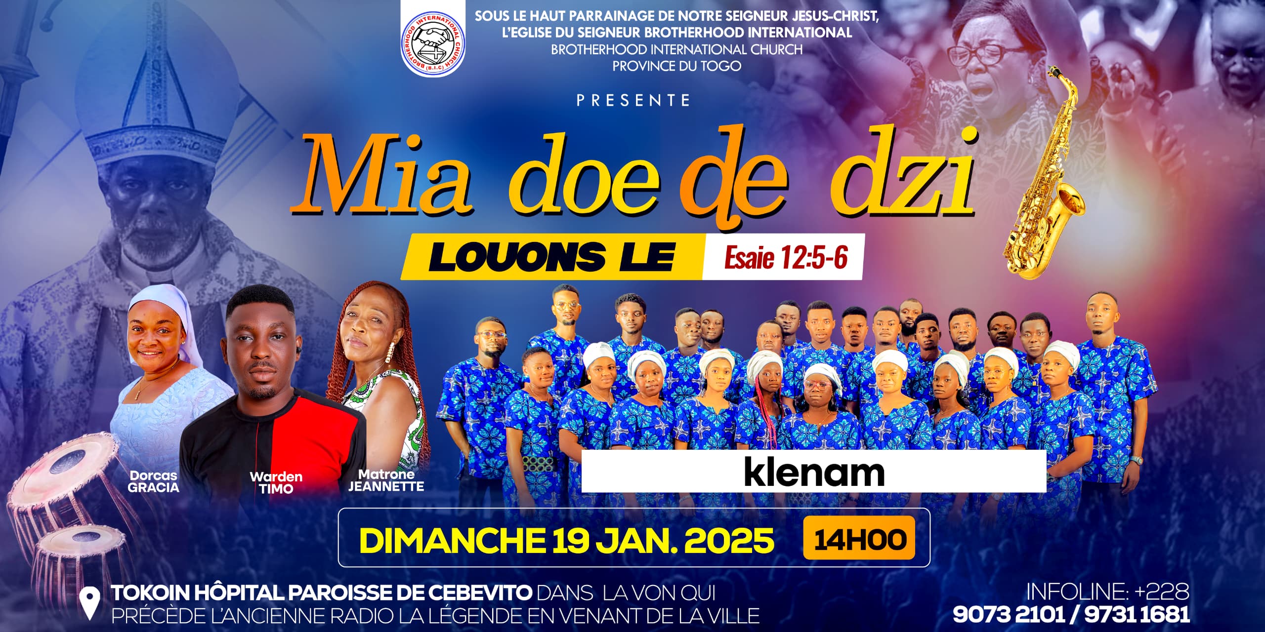 Lomé s’apprête à vivre un moment d’émotion intense ! L’Église du Seigneur Brotherhood International, sous la direction de Son Éminence le Primat William Mensah Fiadonou, et du Vice-Primat AFANVI Koffi Amenouho Isaac, organise un grand concert spirituel dénommé « Mia doe de dzi » (Elevons-le), inspiré d’Esaïe 12:5-6. Cet événement se tiendra ce 19 janvier 2025 à partir de 14h sur la paroisse de Cebevito à Lomé-Tokoin.